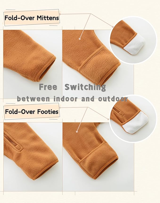 • [Thoughtful design] The double zipper design makes it easy to put on and take off jumpsuits, effortlessly solving the problem of changing diapers! Fold-over mittens and footies, as well as a hooded design, provide extra warmth for babies in cold weather. Indoor and outdoor free switching, can meet your various wearing needs, warm and fashionable.