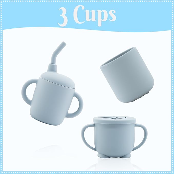 - Baby Led Weaning Supplies: Our silicone bib is designed with a deeper and sturdier pocket, making it highly effective in catching dropped food and easy to clean. The adjustable circular design is particularly gentle on your baby's skin. Our training cup is expertly crafted to fit snugly in your baby's small hands and mouth, safeguarding their developing teeth. Furthermore, the straw is equipped with a spill-proof function, aiding babies in transitioning from breastfeeding and promoting independent drinking.