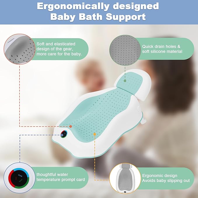 - SIMPLE AND PRACTICAL: Bathing your baby is hassle-free, holding your baby in your arms frees up your hands for washing and playing. With thoughtful water temperature reminder card, you can always show the water temperature change, keep your little one's bath water at the optimal temperature.