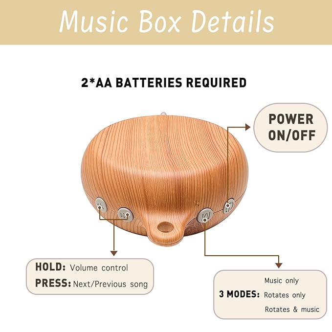 - 【About Music Box】This music box is made of non-toxic, durable ABS material for baby's safety. It offers 12 different lullabies, creating a harmonious and relaxing atmosphere to help babies unwind quickly. Equipped with four buttons – power, M, and two volume buttons. The M button switches modes. Press and hold volume buttons to adjust volume or short press to change songs. Volume is freely adjustable. Three modes available: rotation only, music only, and rotation with music. Automatically shuts off after 30 minutes to save power. Requires 2 AA batteries (not included).