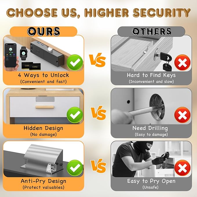 - 🔓【Multi-Access Options】Seamlessly unlock your cabinet with the app, RFID card, or via NFC and supports iwatch unlock for ultimate convenience, eliminating the need for keys and passwords.