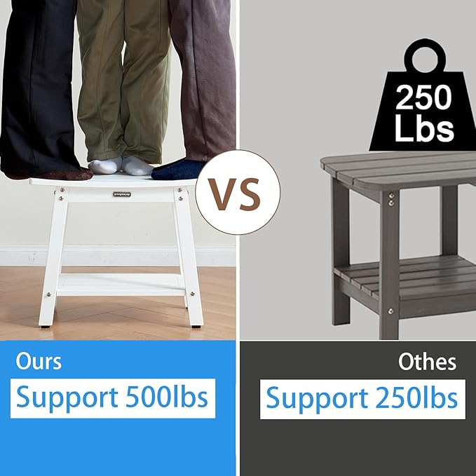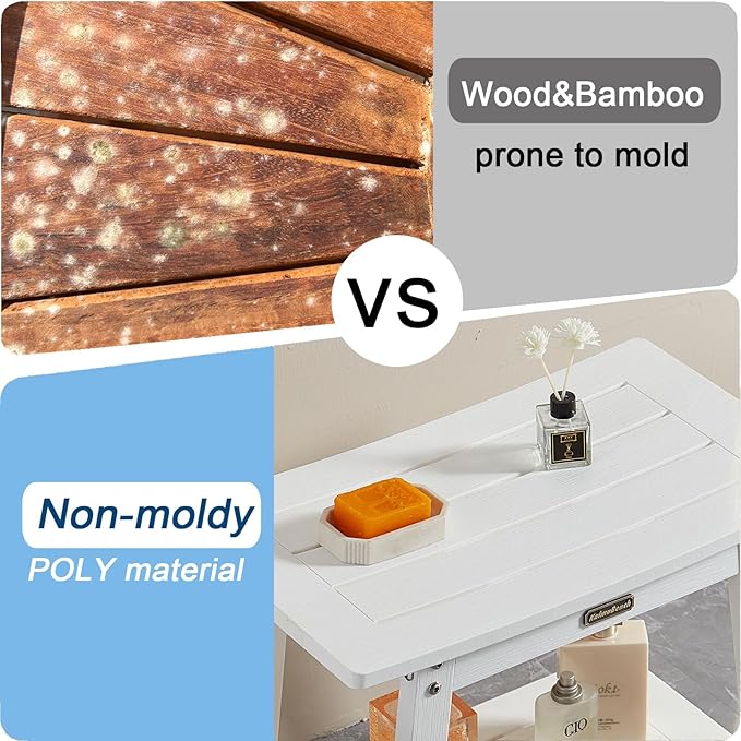 - 【Material & Size】Our shower bench is made of HDPS (polystyrene) with 304 stainless screws which never gets rust, this material is not easy to get m-o-l-d, rotting or crack after prolonged exposure to humidity, no splinters and no maintenance, 21 x 12.6 x 17.7 Inches enough large to sit (THE MOST IMPORTANT IS NO MAINTENANCE)