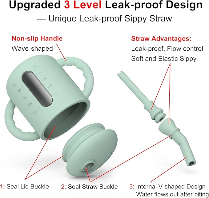 - Leak-proof Straw Cup: 3 levels sealing structure, seal lid buckle + seal straw buckle + internal V-shaped lock, no leakage when inverted/shaken. It is more convenient for babies to drink water independently.