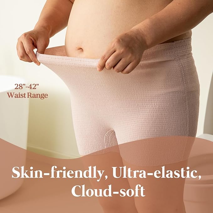 - 𝗪𝗼𝗿𝗿𝘆-𝗙𝗿𝗲𝗲 𝗣𝗼𝘀𝘁𝗽𝗮𝗿𝘁𝘂𝗺 𝗖𝗼𝗺𝗳𝗼𝗿𝘁: Enjoy the softness of these skin-friendly disposable underwear, designed with a high-rise fit for all body types. Their durable, stretchable weave ensures they won't tear. Paired with large, absorbent sanitary pads, you can move freely without the worry of postpartum leaks.