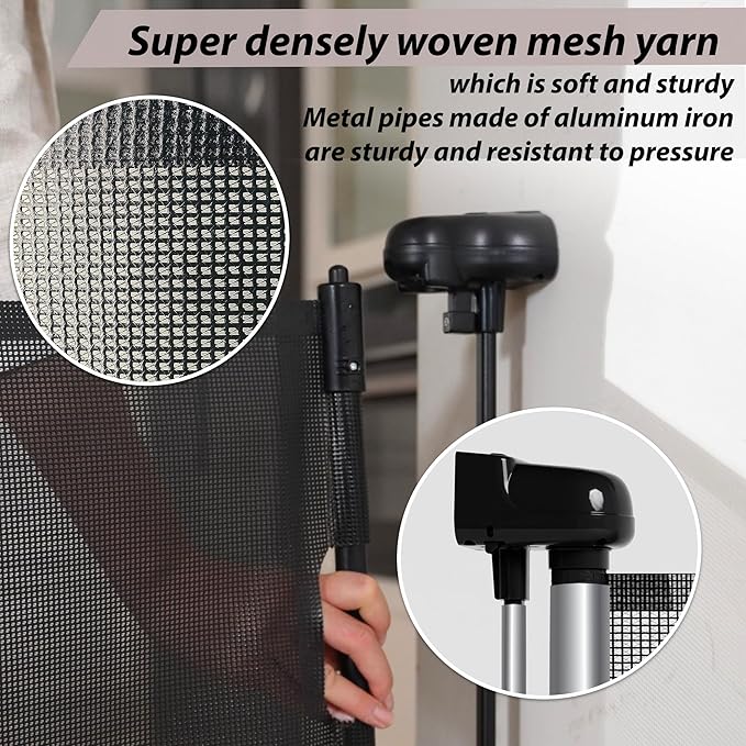 - Safety Double Lock Design - The retractable mesh gate features two locking mechanisms: a mesh lock that controls the mesh's extension and retraction, and a hidden gate lock for opening and closing the gate. Designed for adult convenience, it remains particularly challenging for children, effectively preventing them from opening the gate alone and accessing hazardous areas.