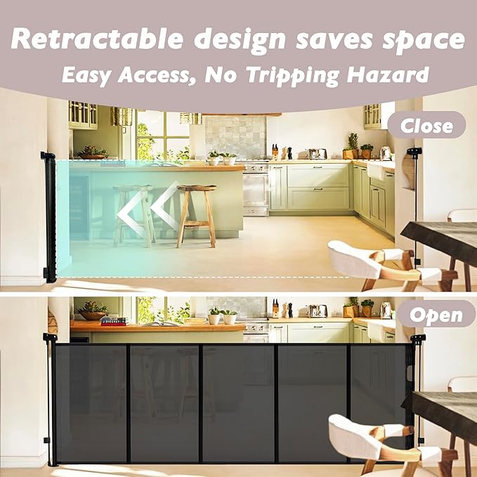 - 41" Heightened and Safer - Our retractable dog gate stands at 41 inches, significantly taller than the traditional 34 inches. It effectively prevents children and pets from climbing over, thereby reducing the risk of falls down the stairs. Itβs the perfect solution for ensuring safety at doors and stairs.