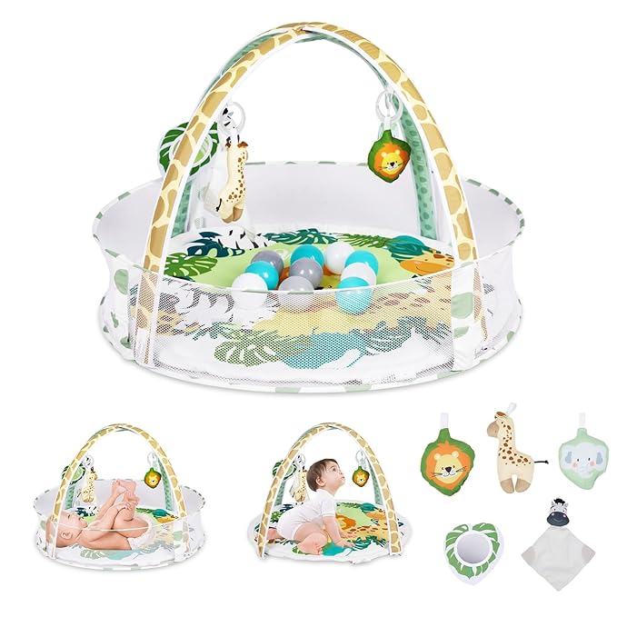 Baby Play Mat, 4-in-1 Baby Play Gym Tummy Time Mat with Ball Pit and 5 Detachable Toys for Newborn to Develop Sensory Exploration and Motor Skill 0-6-12 Months