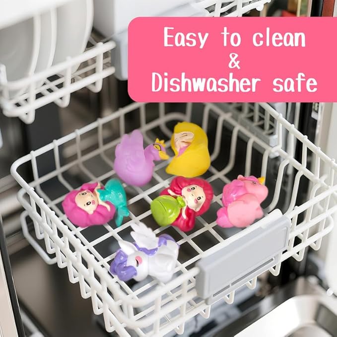 - 8 PCS Princess Bath Toys : Get everything for splashy fun & easy cleanup! Enjoy 6 bright color, sealed bath toys, a easy-grip fishing net(perfect for little hands!), and a bunny-shape bath storage bag with drain holes & strong suction cups. All designed for a hygienic playtime! Say goodbye to bath time battles - hello to joyful splash time!