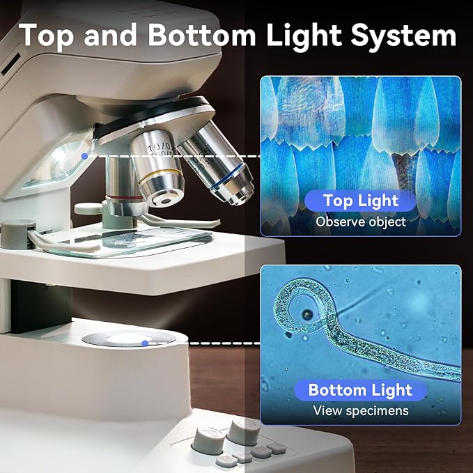 - Dual LED Lighting System: Balanced top and bottom LED lighting with adjustable brightness ensures the clarity needed for slide or specimen viewing—lighting that rivals any dedicated water microscope used in lab settings