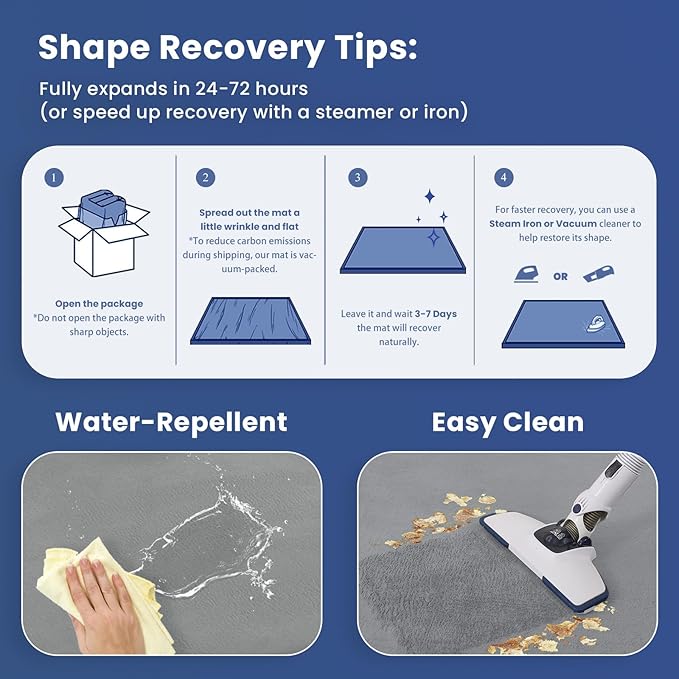 - 【TIPS】: Upon arrival, the baby play mat may need 3-7 days to fully rebound to its original size. If it appears slightly compressed, simply allow time or use a gentle iron to help restore its thickness and shape.