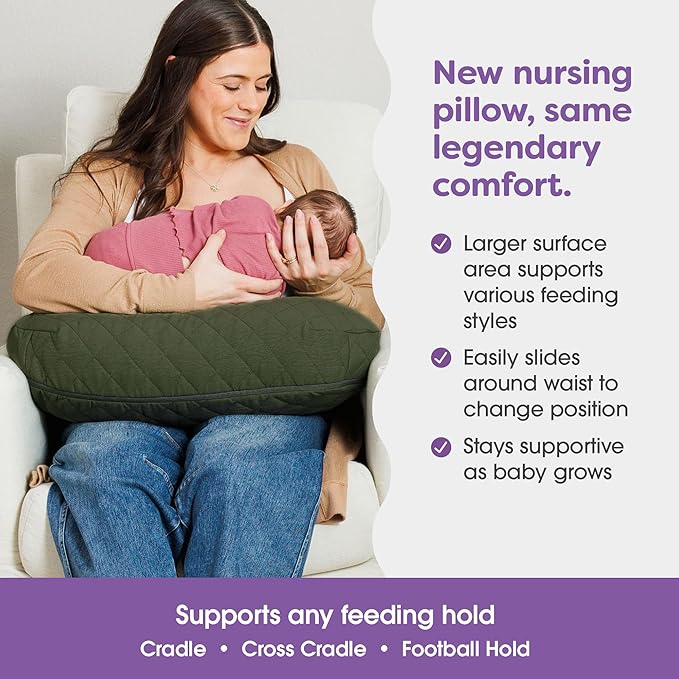 Boppy Nursing Pillow with Luxe Fabric Cover, Quilted Moss, Larger, More Supportive Pillow for Breastfeeding and Bottle Feeding; Firmer and Higher Than Original, w/Premium Cover; JPMA Certified