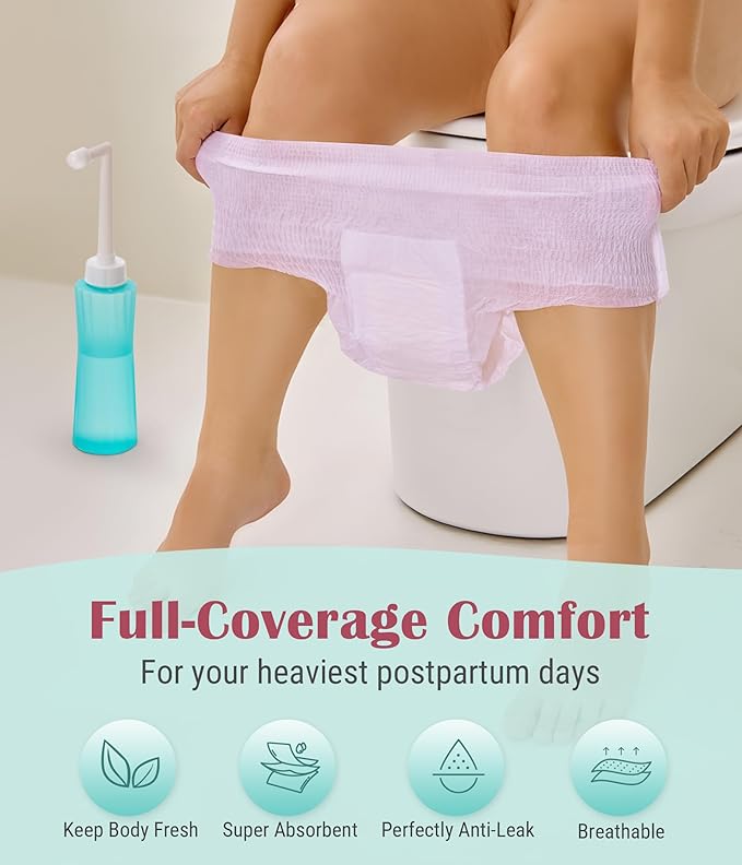 - Complete Postpartum Recovery Kit – Designed to support new moms after childbirth, this 55-piece postpartum essentials kit helps promote recovery, reduce discomfort, and keep you clean and comfortable. It includes a 17oz peri bottle, perineal foam, 2 reusable ice packs with 20 disposable covers, 20 nursing pads, 5 disposable postpartum underwear, 5 disposable bed pads, and a convenient storage bag.