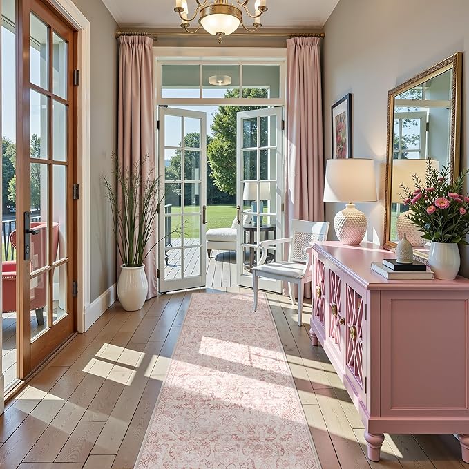 - Deerly Vintage 3x10 Runner Rug: These Hallway runner rug feature trendy faded style and unique neutral distressed floral pattern, vintage tones combines the pink and ivory color, creating a comfortable and warm family environment. 3x10 rug runner is suitable for indoor entrance, bedroom, kitchen, bathroom, etc.