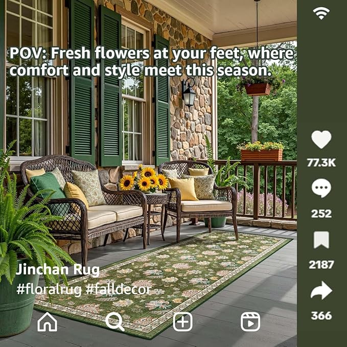 jinchan 3x10 Floral Runner Rug for Hallway Washable Kitchen Runner Vintage Romance Design Non Slip Thin Indoor Floor Cover Low-Profile Throw Carpet for Entryway Bathroom Bedroom Porch, Green