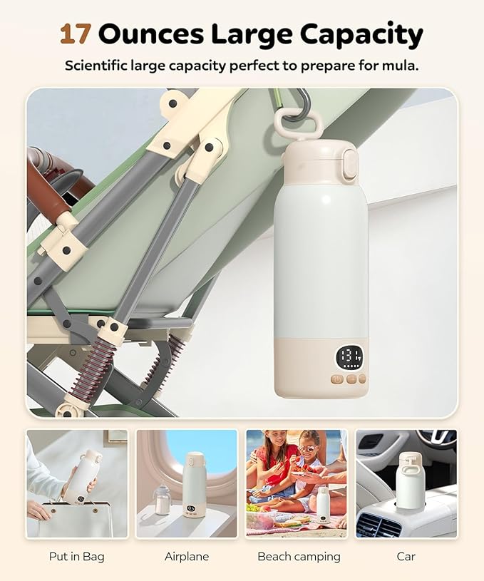Portable Bottle Warmer for Travel, 17 Ounces Milk Warmer for Baby Breastmilk with Fast Heating & Precise Temp Control, Bottle Warmer for Car, Outdoors