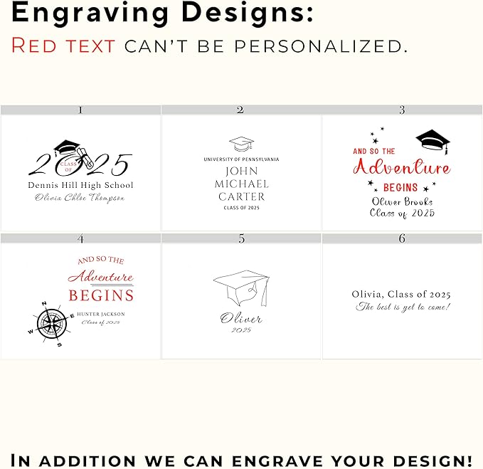 - Make It Personal: Customize your 2025 graduation box with a name, "Class of" year, and school name. We’ll engrave it in the font style shown in the photos. You can also engrave a message on the inside lid (different font choices available). Create a truly special and memorable gift!