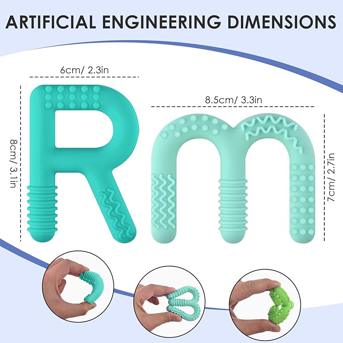 - Multi scenario use: Our sensory teething toys set includes 2 pcs R shaped and 2 pcs M shaped sensory chewy toys. Children with autism, ADHD, and sensory processing disorders can use toddler teething chew toys at home to help relax and concentrate, as auxiliary tools in the classroom to promote learning and development, and as part of sensory training during treatment