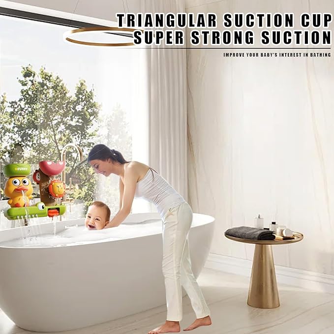 - 【Fun In Bath】The bath toy for toddlers features a duck with eyes that turn and squirt water, a crocodile with teeth that squirt water, and a lion that rotates its head. Pouring water into the container at the top of the toy creates the effect of running water and waterfalls, so children can learn about water and stimulate creativity and imagination.