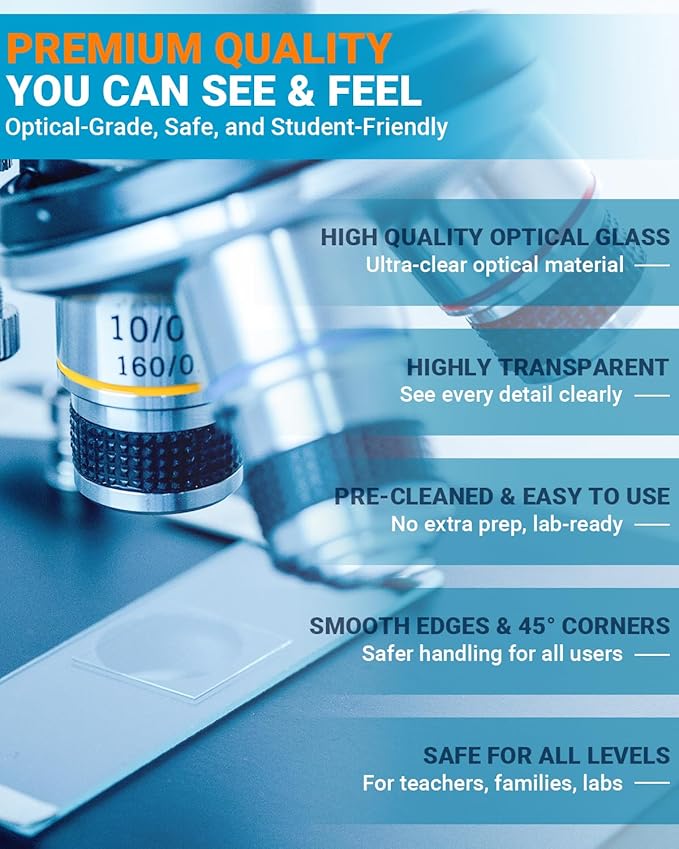 - Safe for All Ages:Each slide features polished edges and 45-degree clipped corners for safer handling in classrooms, homeschooling, or family STEM projects. Compatible with kids' microscopes, making it safe and accessible for young learners