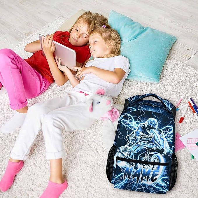 Personalized Backpacks for Boys, Motorcycle Backpack with Custom Name for Kids Kindergarten Primary Elementary Senior Middle, 17 Inch Lightweight Cool Lightning Schoolbag