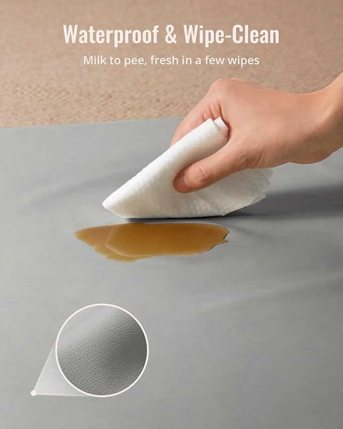 - Waterproof & Easy to Clean: Unlike many other mats that absorb spills, this Vegan leather baby play mat is 100% waterproof, making it effortless to clean. Just wipe it down with a damp cloth to remove food, milk spills, or any other mess, keeping your baby's play area spotless and hygienic