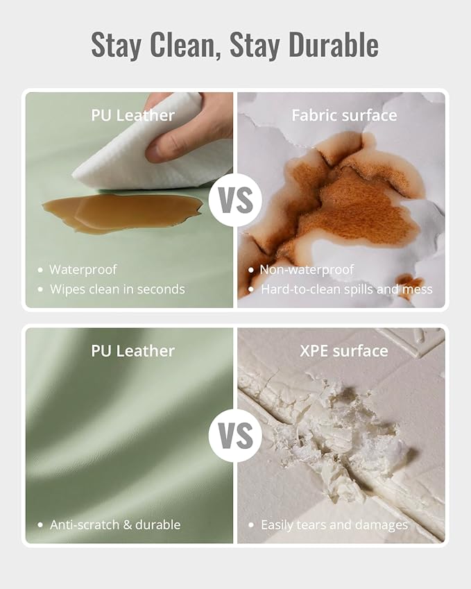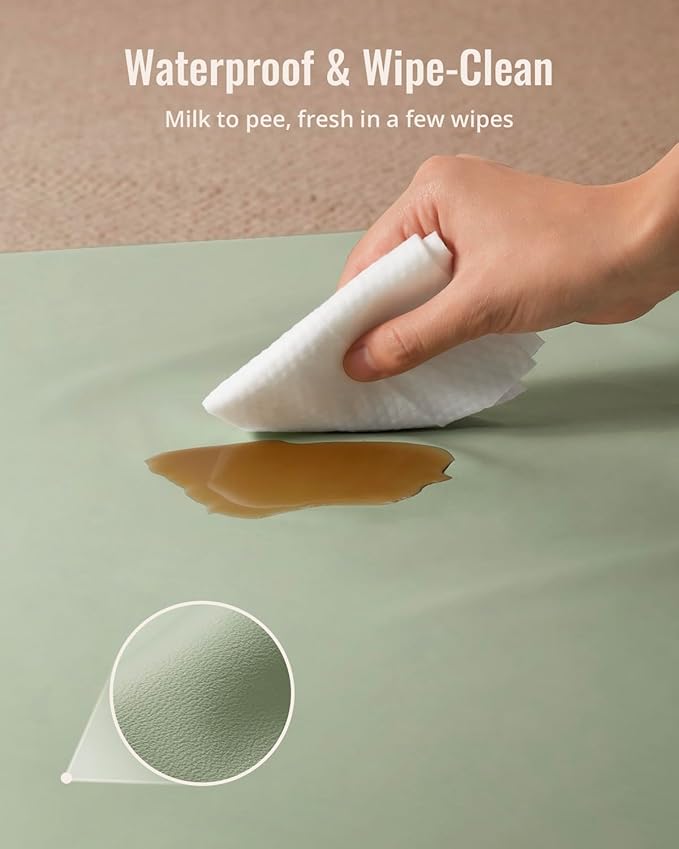 - Waterproof & Easy to Clean-Unlike many other mats that absorb spills, this vegan leather baby play mat is 100% waterproof, making it effortless to clean. Just wipe it down with a damp cloth to remove food, milk spills, or any other mess, keeping your babyβs play area spotless and hygienic