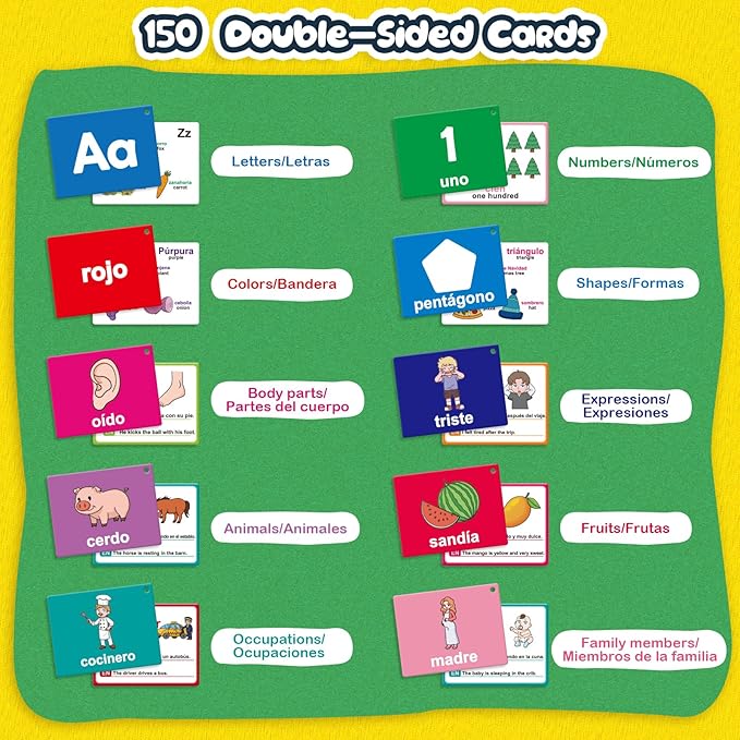 - Spanish Flash Cards: Featuring 150 double-sided flash cards and 10 bright rings, this cognitive flashcard set helps toddlers develop foundational skills. It covers key learning topics including letters, numbers, shapes, colors, animals, occupations, first words, body parts, and different fruits.
