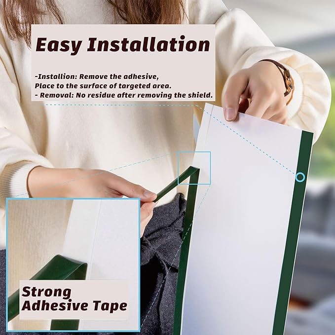 - 【Easy Installation - Step 1】Target the cover area on the door and frame > Clean and dry > Close the door for easy installation > Adhesive strips are on the left and right edges of the shield > Remove the adhesive liners a bit of either the edge on the shield.