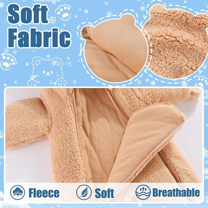 - 🐻【Warm Design】 The infant winter thick fleece hoodie footie one-piece design, the baby's head and ears can be wrapped. Baby winter snowsuit with hands and foot wrap, which keep baby's hands and feet warm when going out, perfect for cold winter.