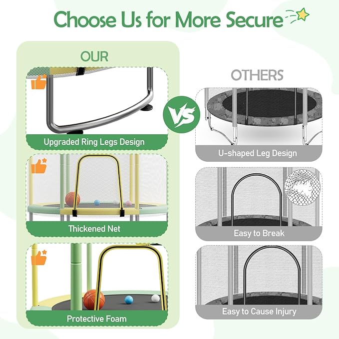 - 【Sturdy, Shock-Absorbing Structure】Built with a square-insert alloy steel frame, this 4.5FT/5FT trampoline provides maximum stability and support. Rust- and corrosion-resistant, with U-shaped legs and anti-slip pads that reduce noise, absorb shock, and protect floors. Safety tested and supports up to 440 lbs.