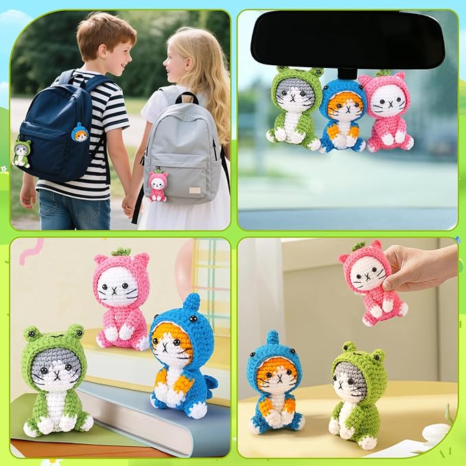 Crochet Kit for Beginners - 3 PCS Crochet Kits with Step-by-Step Video Tutorials, Beginner Crochet Kit for Adults Kid, Crochet Animal Kit for Starters, Cat Dressed as Shark Frog Strawberry