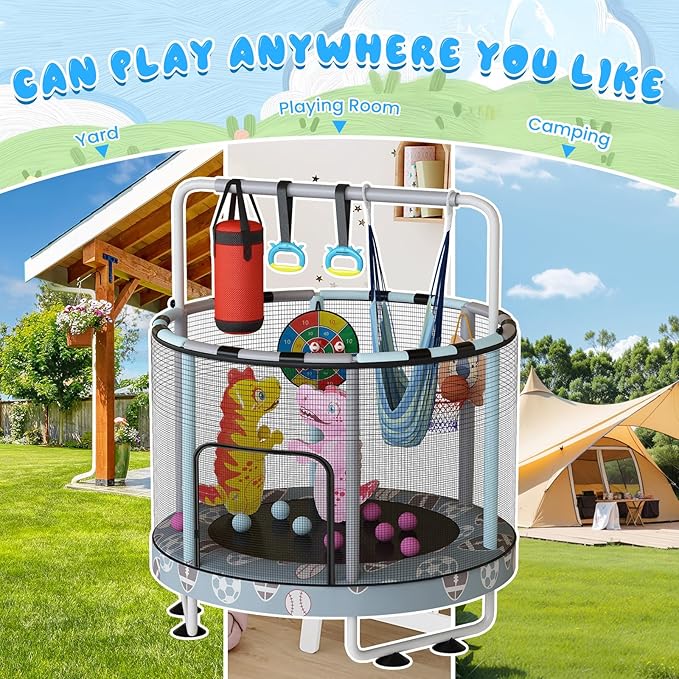 - ✨【7-in-1 All-in-One Play Center】More than just a trampoline—this versatile activity hub includes a swing, basketball hoop, dartboard, hanging rings, inflatable dinosaurs, and ocean balls. Keeps kids active and entertained while boosting creativity, coordination, and motor skills.