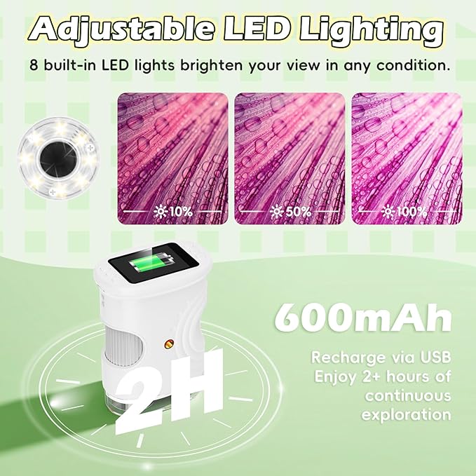 - Portable Pocket Size for On-the-Go Science: Weighing only 136g (0.3 lbs) and measuring about 4” x 3.15” (10cm x 8cm ), this mini microscope for kids fits perfectly in toddlers' small hands and pockets. It comes with a convenient neck strap, a compact and lightweight design makes it ideal for both indoor fun and outdoor adventures, encouraging discovery anytime, anywhere