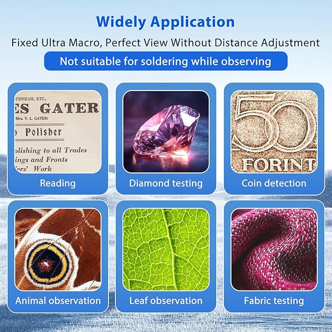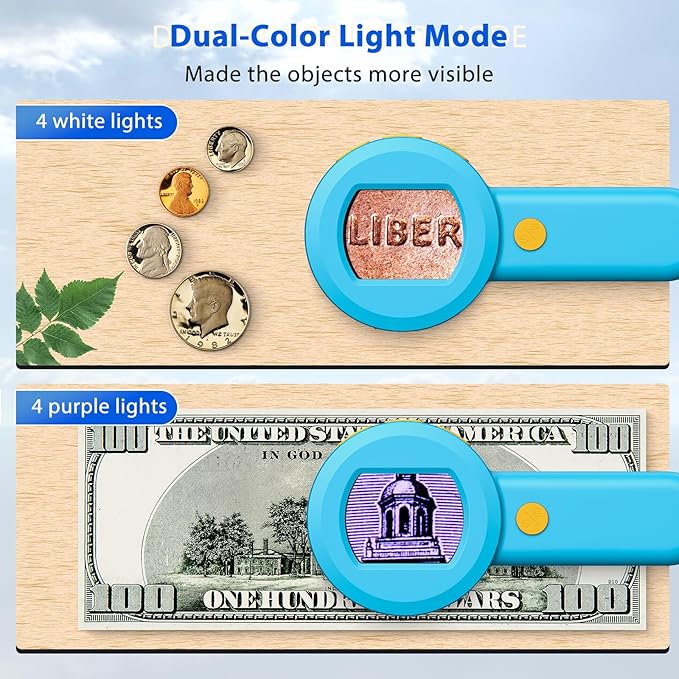 - Dual Light Source for Clear Imaging: Featuring 4 white LED lights and 4 UV lights, this jewelers loupe ensures bright, clear images. Ideal for examining stamps, banknotes, and intricate items, you can easily switch between white and UV light for enhanced detail.