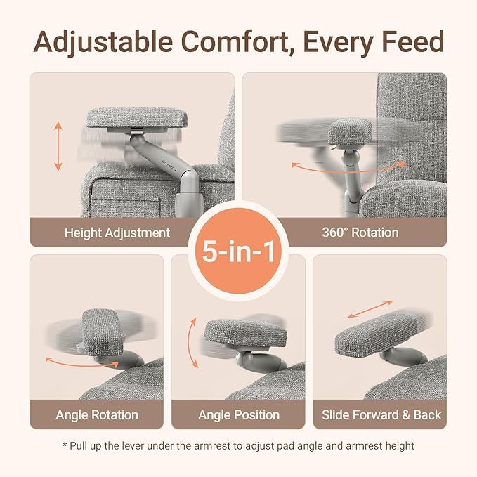 - π ππ ππππ‘π π‘π¨π₯π¦ππ‘π πππππ₯ ππΆππ΅ ππππ¨π¦π§ππππ ππ₯π π₯ππ¦π§π¦, πππππ₯ππ¦π§ & ππ¨ππ-ππ’ππ¬ π¦π¨π£π£π’π₯π§: Height-adjustable and 360Β° swivel armrests adapt to different nursing positions, helping moms hold their babies closer to the breast for a more natural latch. Nursa Plus Nursery chair creates a dynamic support system that adapts to your body. It precisely supports head, arms, waist, and legs to reduce fatigue during long nursing or sitting sessions