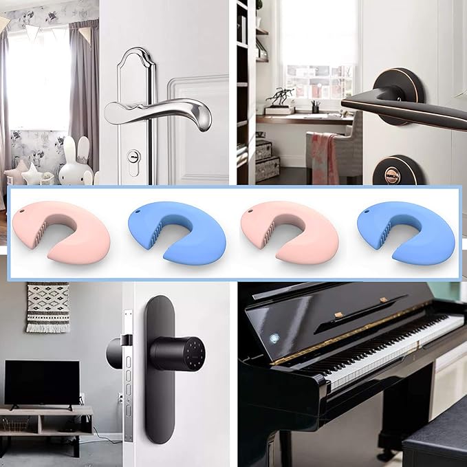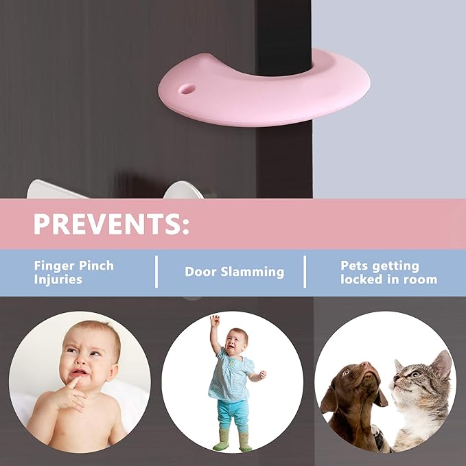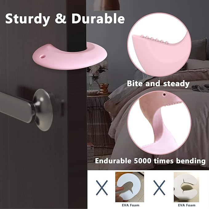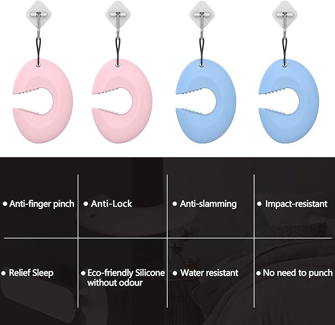 - Intelligent Design Toddler Door Stopper: Flexible C Shape makes it easy to attach and fits around any size door. The door slam stopper Innovative 'teeth' make the pinch guard and door combination more stable, therefore it will not fall off even with a strong slam.