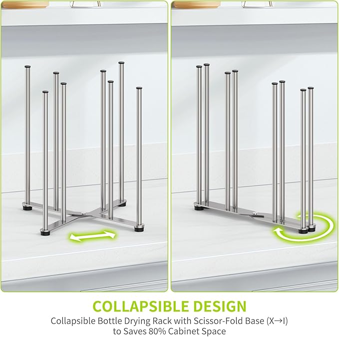 - 【Collapsible & Space-Saving】: Effortlessly convert between stable X-shape (for heavy drying tasks as 8 baby bottles or holding ziploc bags for filling for food prep) and slim flat I-bar (for storage). This foldable bottle drying rack perfect for small kitchens, RVs, and apartments, easy to store in drawers or cabinets when not in use.