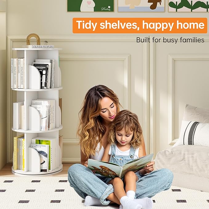 - 【360° Silent Corner Bookshelf for Kids & Adults】 Experience effortless rotation with our rotating bookshelf tower! Specially designed with smooth bearings, even children can spin it quietly to access books. Perfect as a kids bookshelf or family library center, it eliminates noise distractions while maximizing corner space.