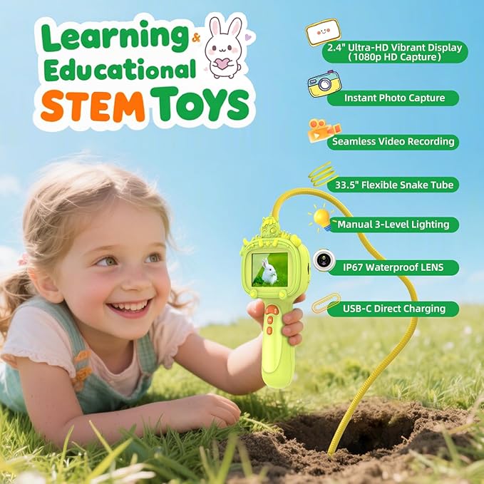 - IP67 Waterproof Adventures: Dive into aquatic fun with the snake camera with lightβs IP67-rated tube, ideal for probing ponds, streams, or fish tanks in rainy settings. Kids aged 3-12 can discover submerged plants or fish safely, making this durable tool a top pick for all-weather outdoor exploration